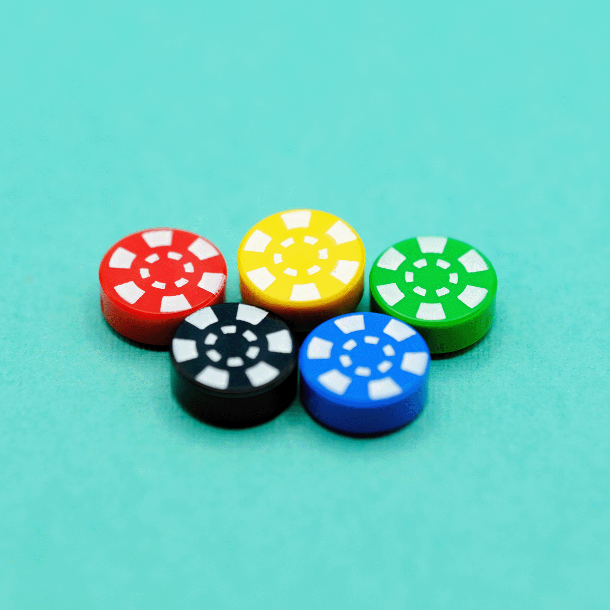 Pack of 5 classic colored poker chips. Includes red, green, yellow, black, and blue colors.